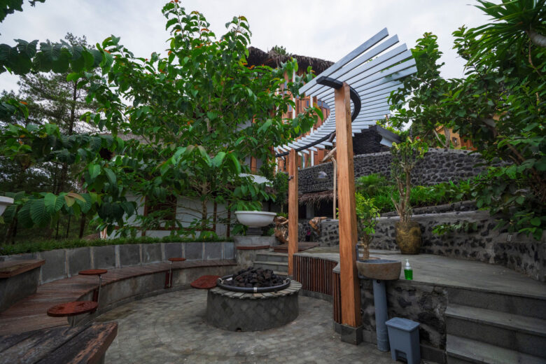 The fire pit area when viewed from above resembles a tiara. The patio provides shade from direct sunlight during the day. At night, the fire pit is lit and provides warmth and social pleasantries. The fire pit bowl is made of local pumice from the nearby mountain. It is a fitting place to gather given the unique location of Tira Vilagna Suites & Spa which is surrounded by 3 mountains. East is Mount Agung, North is Mount Batur and in the West is Mount Batukaru. Also 3 other mountain sceneries can be seen from areas of the hotel: Mount Catur, Mount Pucak Antap Sai Bon and Mount Pucak Mangu Mount. Guests can relax around the fire pit warming the body while contemplating the surroundings: ship shaped pendopo / pavilion and the unique banyan trees.