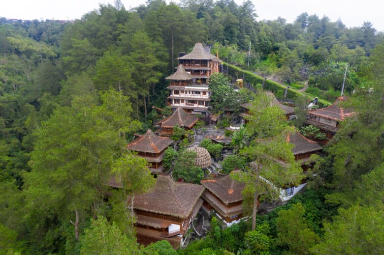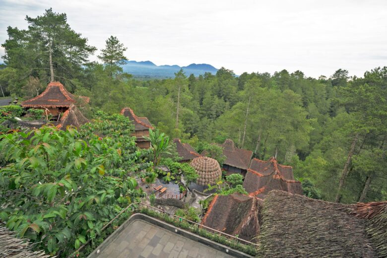 The playful architecture features grass roofs, timber cladding, intricately-carved pendopo structures, archways and bridges, shallow stairways and relaxation gazebos, resourcefully integrated into the natural contours of the hillside. Here, romantic interiors and handcrafted artistry is intermingled with contemporary notions of privacy and comfort, capped with exemplary personal service.