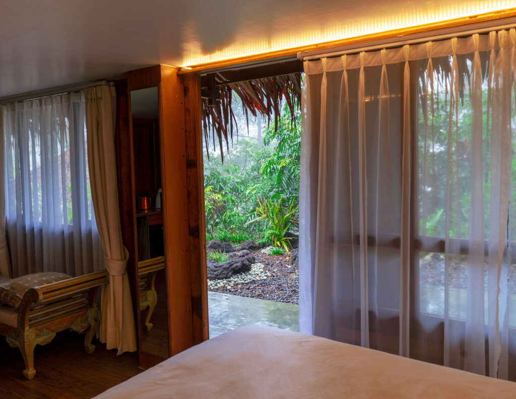 Each suite has a sheltered balcony offering spectacular views of the forest. Two of the suites have the benefit of an adjoining private garden with the forest beyond. One of these has a king-size bed and the other has a queen-size bed.
